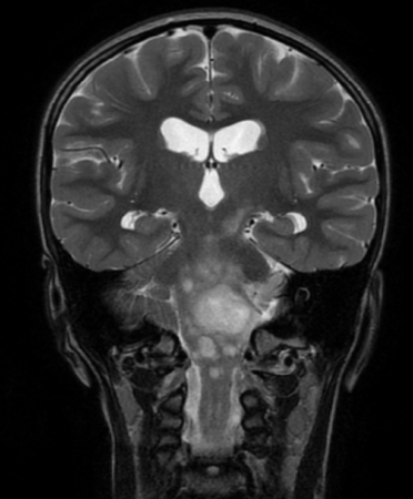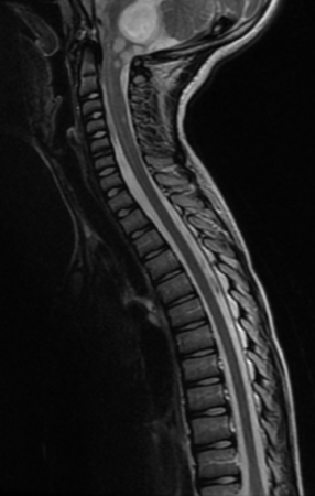 This is a de-identified MRI scan from the REDCap database depicting numerous discrete lesions including fourth ventricle, thalamus, midbrain, cerebellum, brainstem and spine, highlighting the disseminated disease. (image courtesy/Michael Dewan, MD)